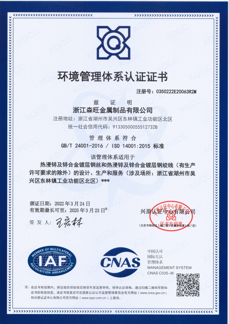 浙江森旺金屬制品有限公司成立于2012年,坐落湖州市吳興區東林鎮工業功能區。公司專業從事各類鍍鋅鋼絲、鋼絞線等產品的開發及生產。目前產品已廣泛應用于各類通信光電纜,電力輸送,電氣化鐵路工程,各類堤壩防護及農業溫室等工程領域。公司秉承“追求卓越品質,創建卓著信譽”的經營理念,始終堅持專業化、規?;慕洜I模式。